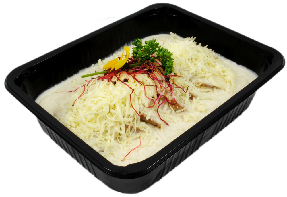 Schweine-Orloff (Schweinefleisch, Käse (MILCH), gekochter Schinken, Salz, Pfeffer), Pilzsauce (Pilze (weiß und Waldpilze), Fleischbrühe (enthält ZELERI), Sahne (MILCH), braune Mehlschwitze (enthält WEIZENGLUTEN))