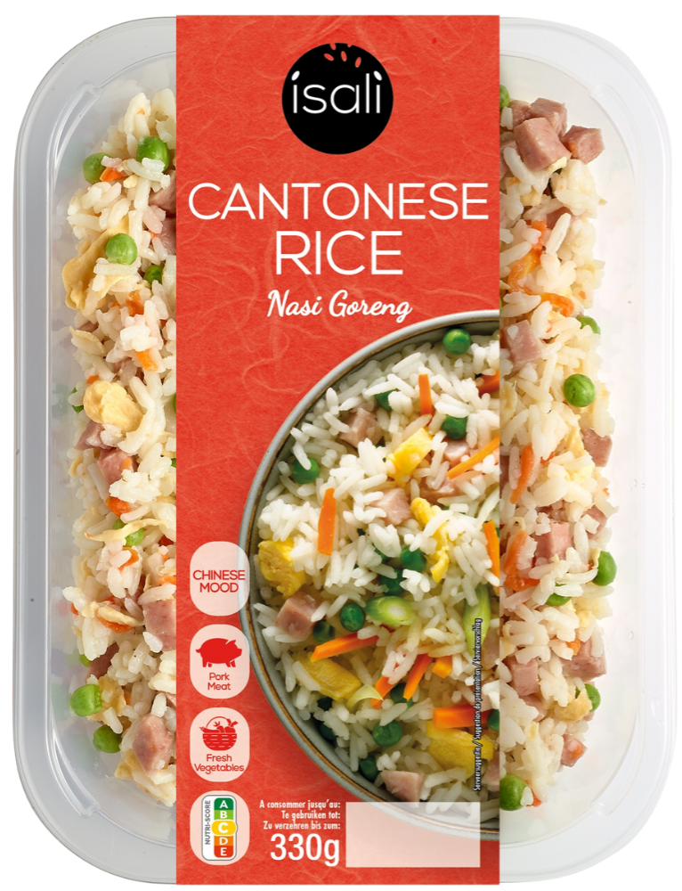 Wasser, Reis (23%), Schinken (17%), _Eier_ ganz 12 (15%), Markerbsen (4.6%), Zwiebel, Karotten (4.6%), Sojaöl, Sojasauce, Gewürze, Speisesalz, Gewürze, Zucker, Geschmacksverstärker, Sonnenblumenöl, Schweinefleisch, Wasser, Kartoffelstärke, Speisesalz, Glukose, Aroma, Emulgator, Antioxidant, E316, Konservierungsstoff, E250, Zucker, Melasse, Wasser, Soja, Weizen, Speisesalz, Essig, Reisstärke, Natürliches Aroma, E621, E451i