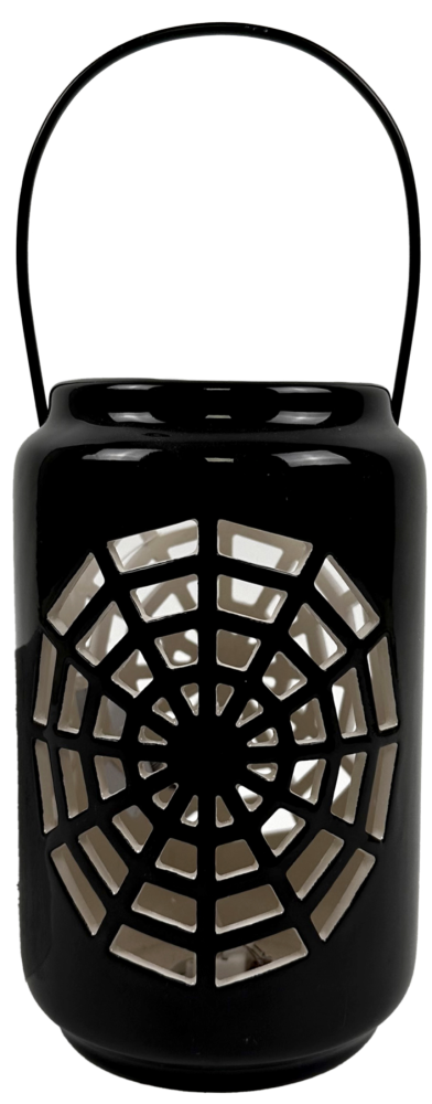 Brighten up your Halloween decor with this black ceramic spiderweb lantern. Its glowing interior creates a mysterious and spooky atmosphere.