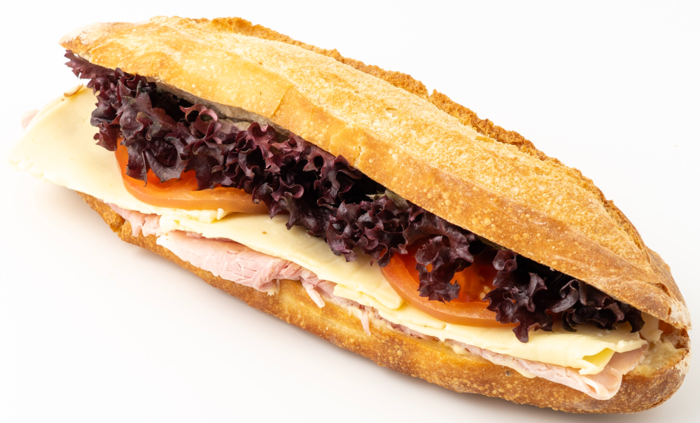 Pain (farine de BLE, eau, levure, sel, GLUTEN DE BLE, levain de SEIGLE désactivé, levure séchée désactivée), Jambon cuit (viande de porc, saumure(eau, sel, épices, herbes aromatiques, conservateur : E250), fumée), Fromage (contient LAIT), Tomate, Salade verte, Mayonnaise (contient OEUF, MOUTARDE), Beurre (contient LAIT)