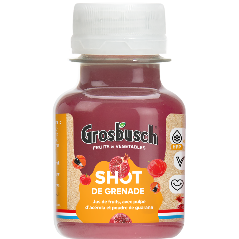 Jus de grenade (66,83%), jus de pomme (25%), jus de betterave (2%), jus de citron (1%), poudre de guarana (0,17%)