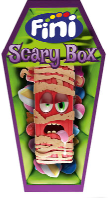 An dësem Sarg fannt Dir: 3 Finitrons Marshmallows, 2 Fini Fizz Strips, 2 BOOOM Bubblegums, 2 Mini Boosters, 2 witzeg Gesiichter Lollipops an 1 Täsch mat Mini-Spiky Bieren.