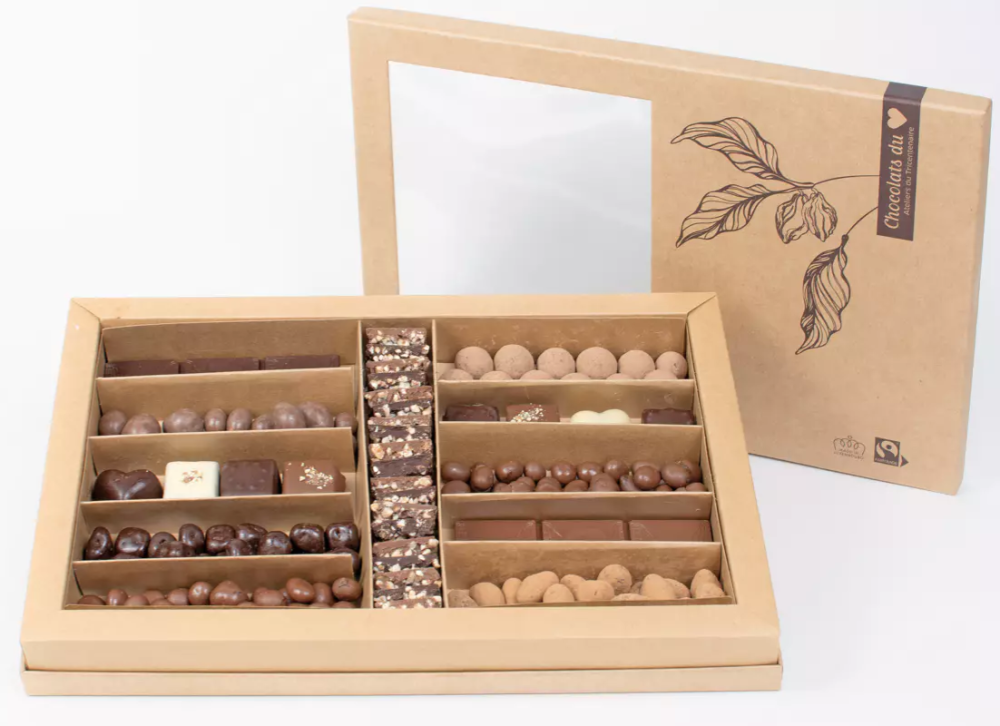 Pralines, carrée croquants, raisins secs, orangeats, amandes, noisettes, cacahuetes, tablette de chocolat au lait, tablette de chocolat noir